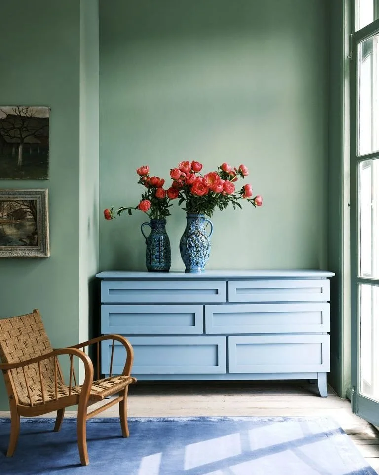 For a classic color combo, pair Breakfast Room Green walls with the brand’s slightly green, off-white James White on neighboring trim. A traditional palette would combine this green with Book Room Red and Lulworth Blue. For something more contemporary, try it alongside Mole’s Breath or Hay.