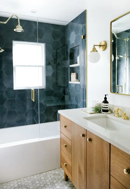 For example, if you’re considering a 3” x 9” subway tile for your shower, going with something else rectilinear like a 12” x 24” tile for the floor would create a nice visual tie-in. You could even go a step further to connect the dots by using the same brick lay installation for both applications. Similarly, if you’ve found a larger format hexagon tile that you love as a backsplash or basin surround, a small scale hexagon mosaic would be a great compliment for the shower floor, or to accent a niche.