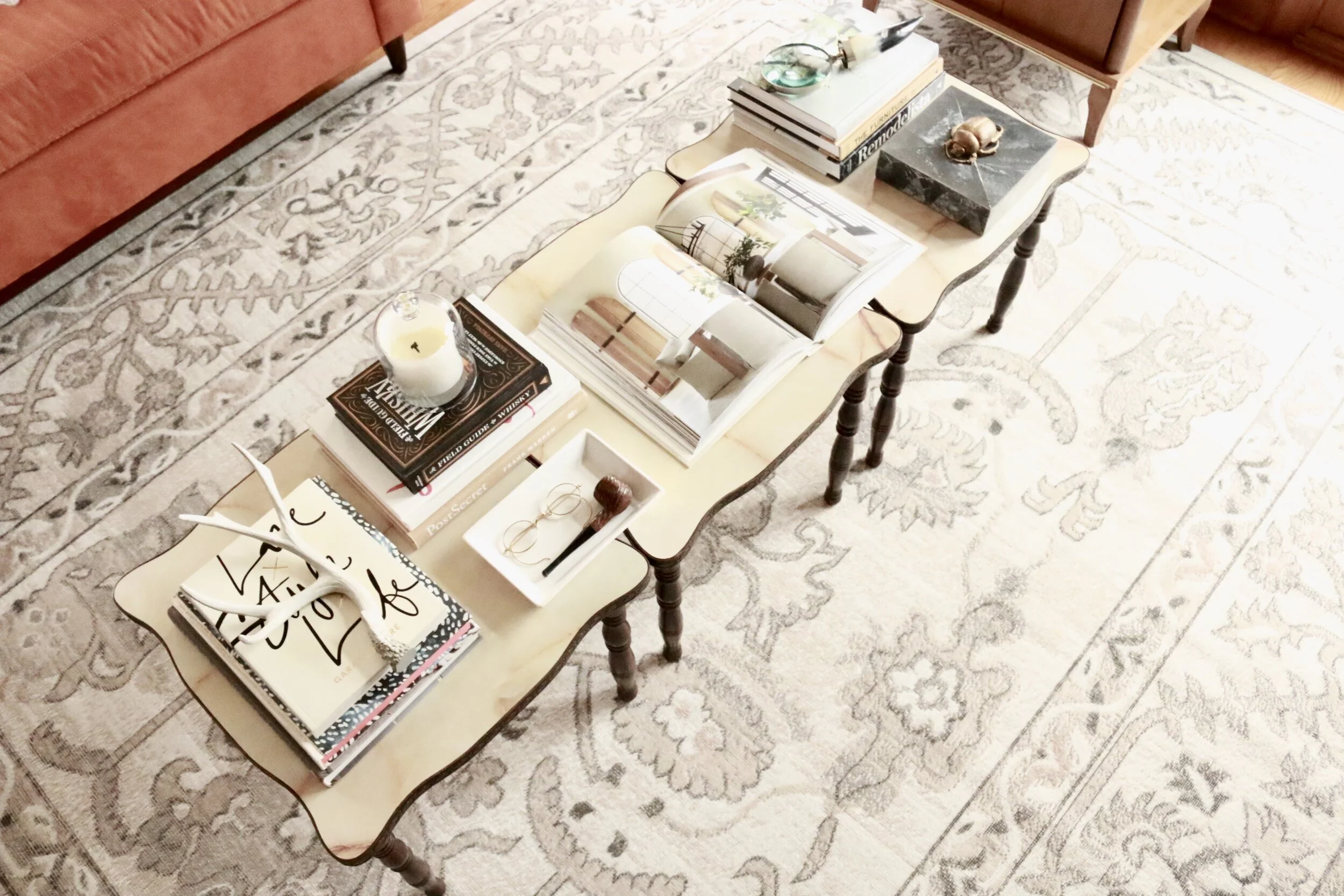 Books can be used to complement or emphasize a color story, whether you’re adding a pop of color or toning down a busy vignette. They’re also a great base to elevate or highlight a unique or favorite accessory. We can’t forget the wonderful texture and warmth they bring to a space!