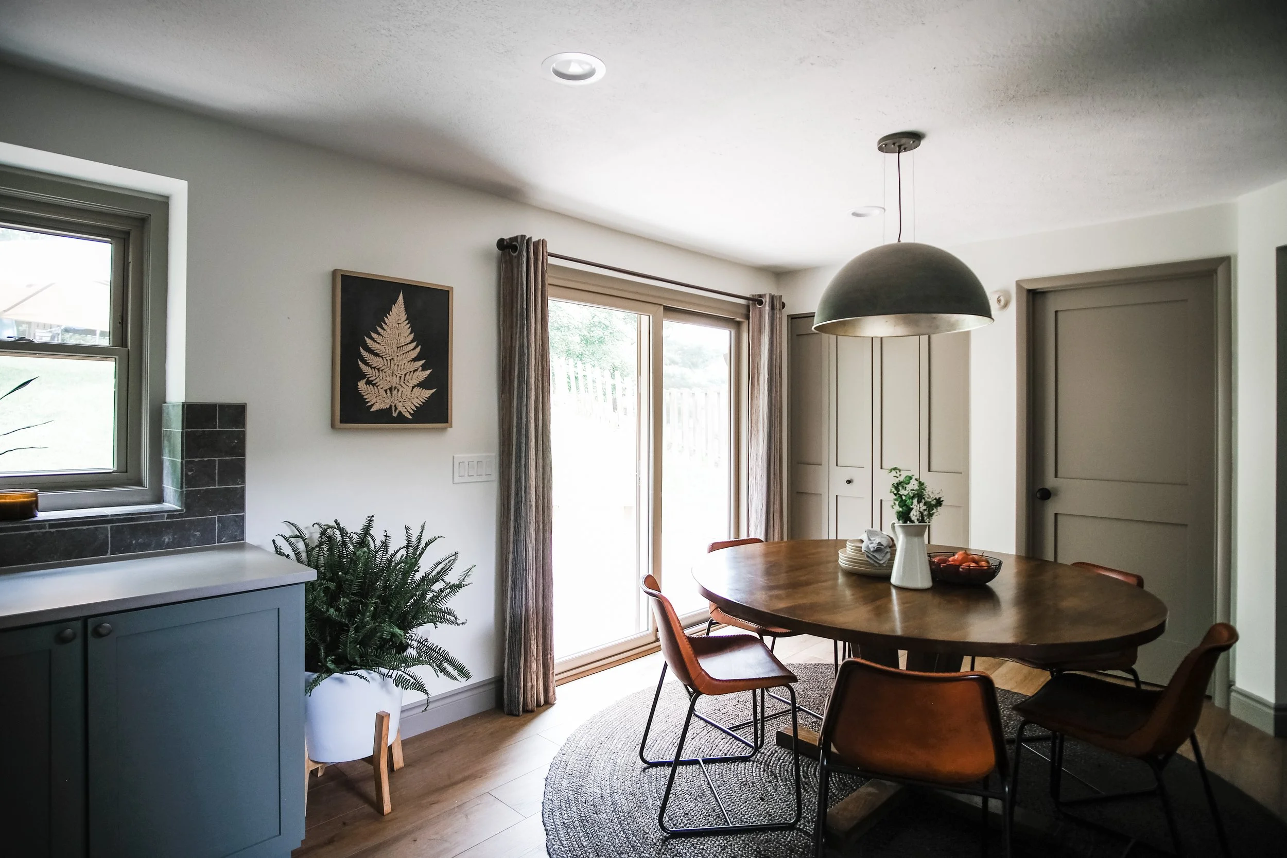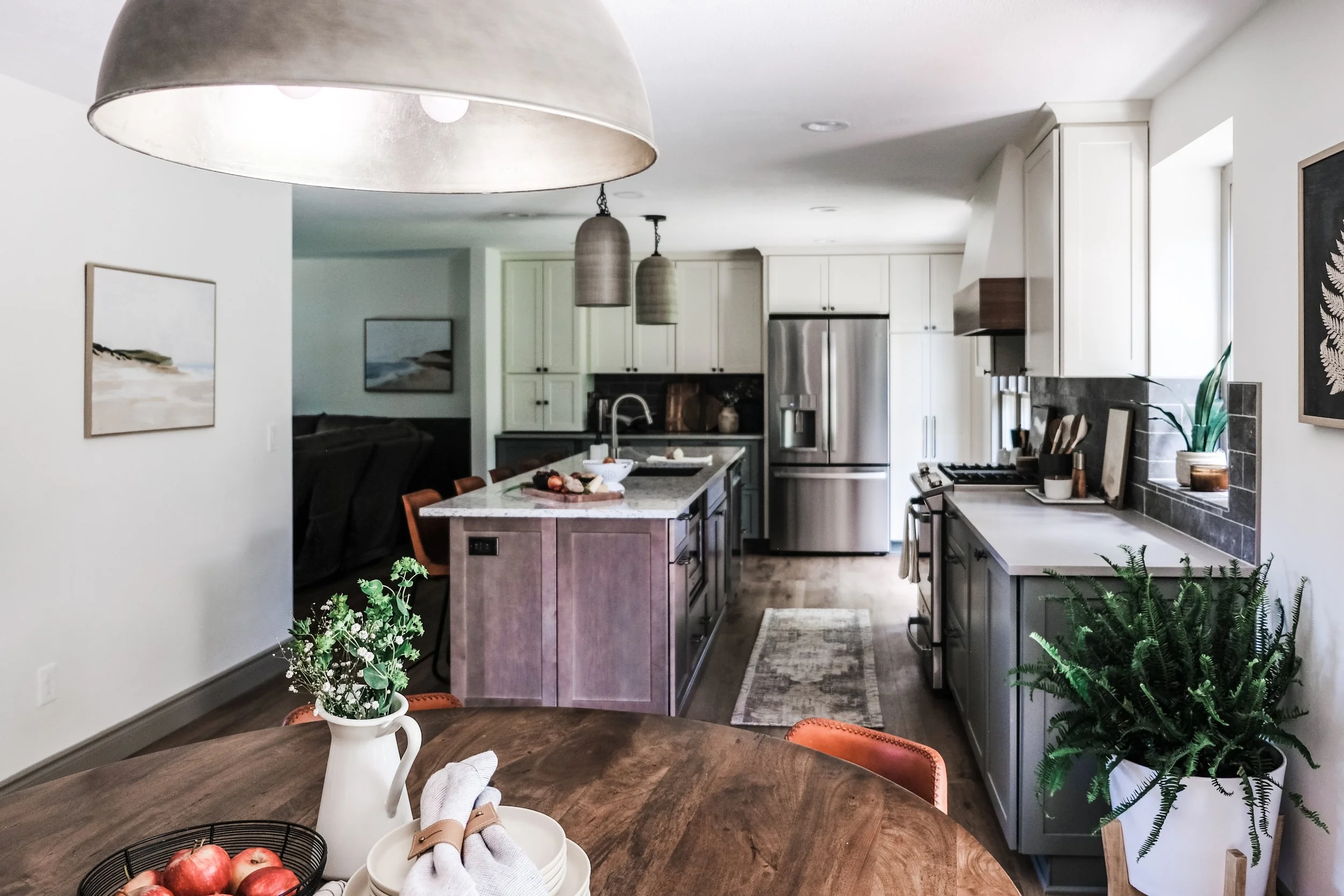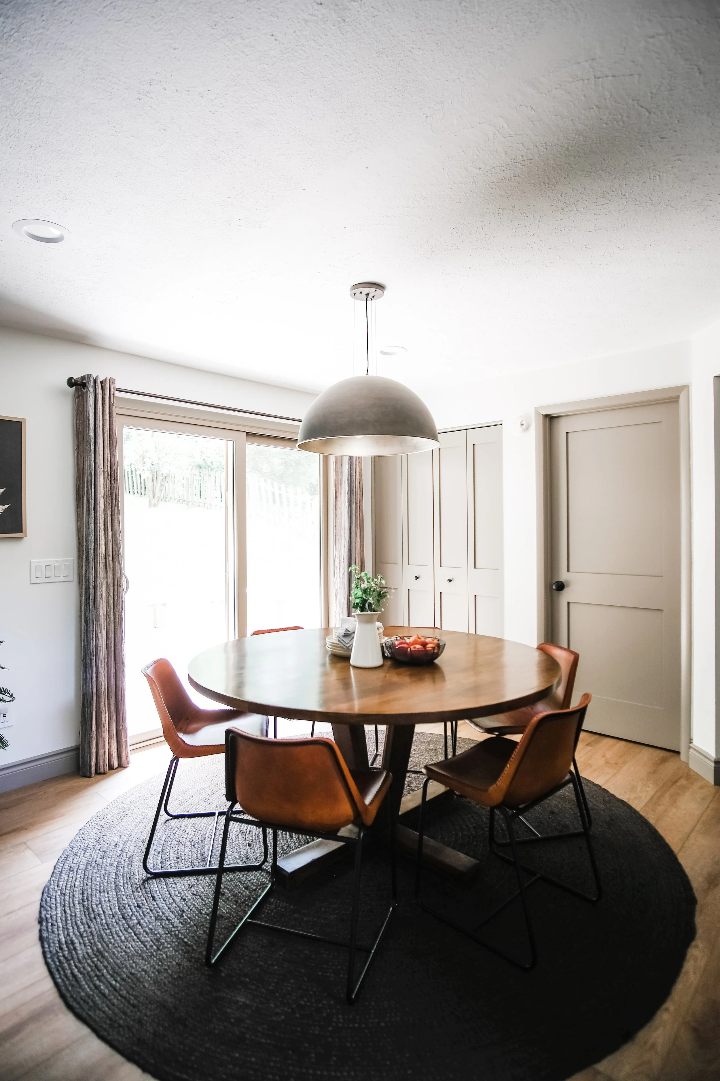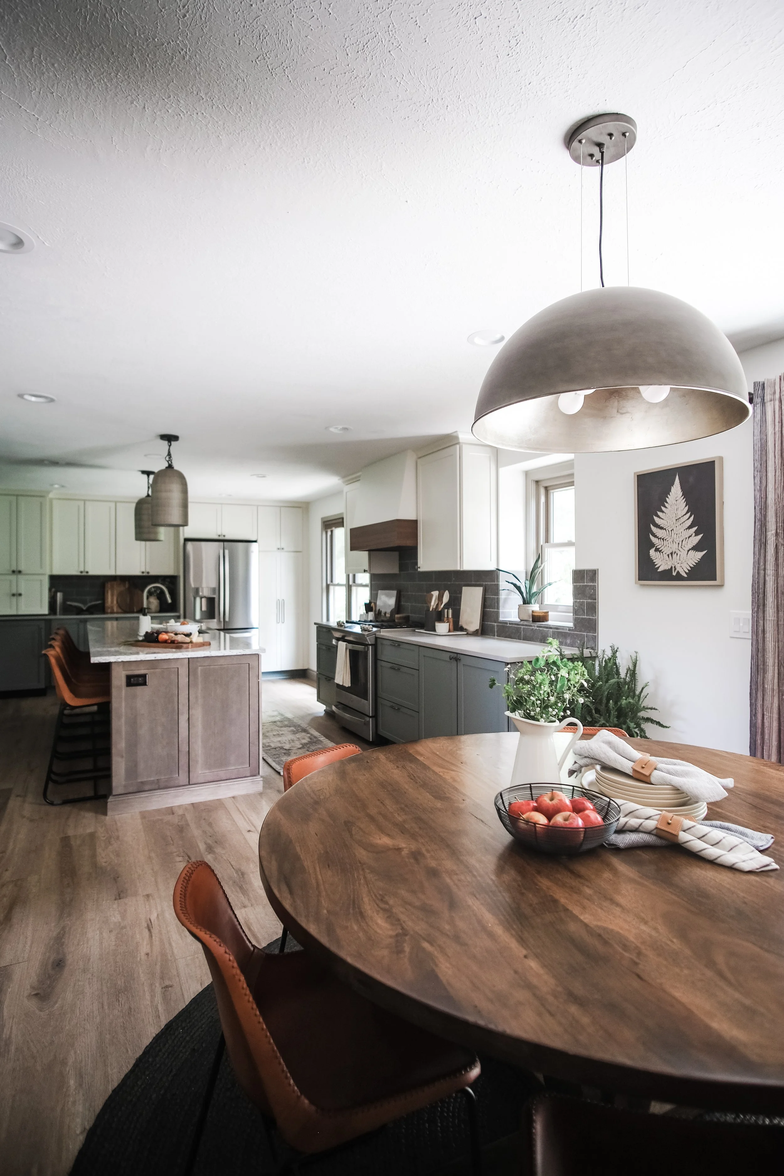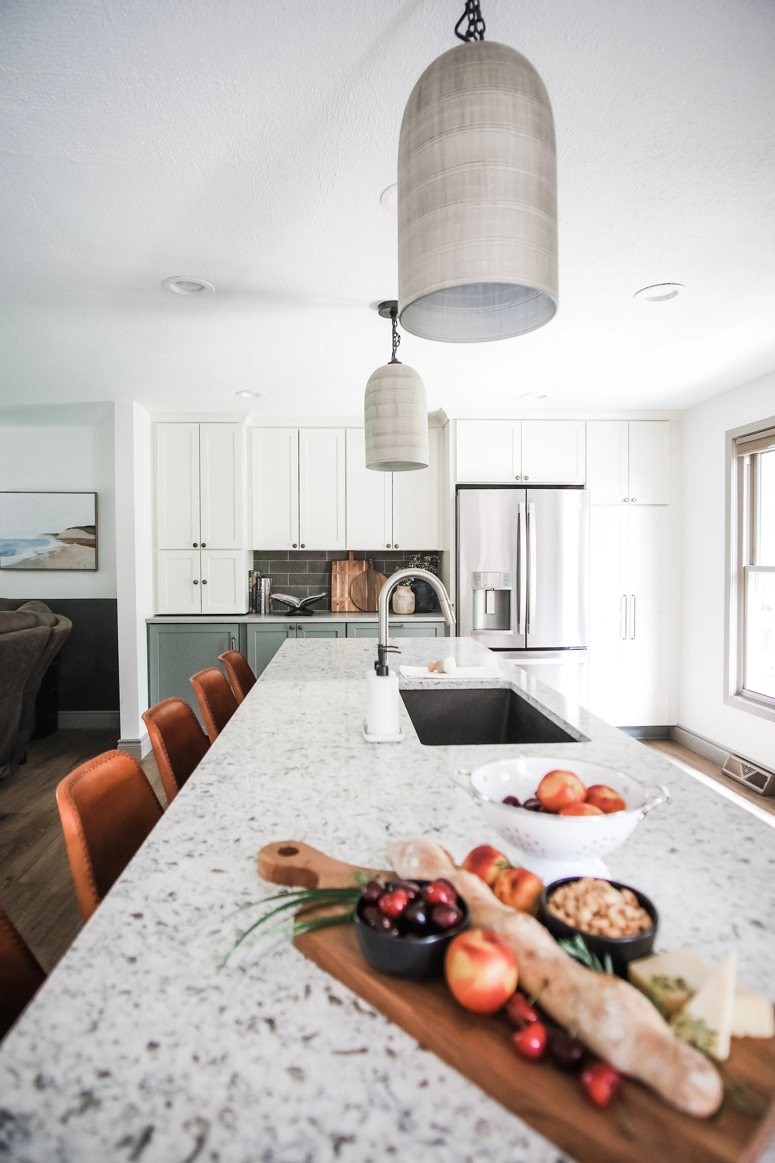 When we first met this family of six, they told us that one of the things they loved most about their home was the amazing outdoor space — especially the backyard! Our design plan brought the outside in for them, with a cabinet palette of rich browns and colorful greens accented by a warm, off-white on the wall cabinets which helped fill the room with light. We incorporated tons of great texture throughout from coin-edge detailing on the cabinet hardware, to the sueded limestone backsplash, and lustered metal and glass light fixtures. A two-tone countertop scheme of classic cool gray Raw Concrete with the unique and highly marbled Montclair White quartz adds visual interest and keeps things feeling current and fresh. To help soften the space and add warmth, a large reclaimed mango wood dining table rests on a round jute rug, who’s braiding mimics the woven cording found on the saddle leather dining chairs and counter stools.
