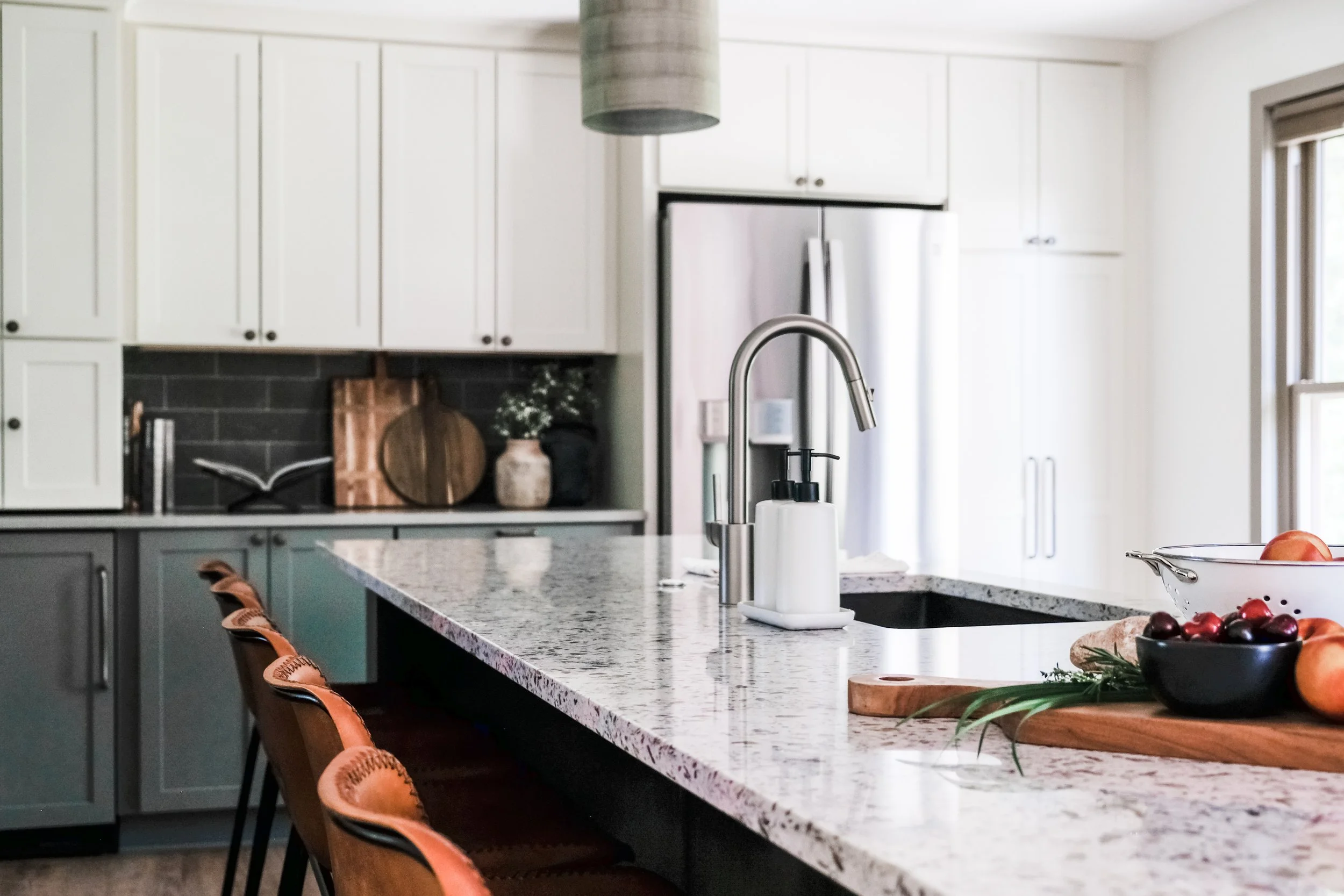 Since plenty of storage, and space to gather for meals and entertaining were two of the main priorities for this family, we removed a wall in between the existing kitchen and a neighboring living space. This substantially expanded the kitchen’s footprint which allowed us to accommodate a ten-foot island with lots of seating for the whole family, plus ample cabinetry all around. On the far end of the kitchen, the counter-depth refrigerator is flanked by a full wall of cabinetry, including a double pantry, convenient appliance garage, and a concealed beverage center within reach of the family room.